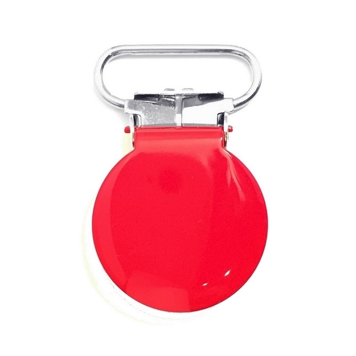 Seleclips til f. eks. suttekæder, selebukser eller barnevognskæder. Den runde seleclips er i farven rød.