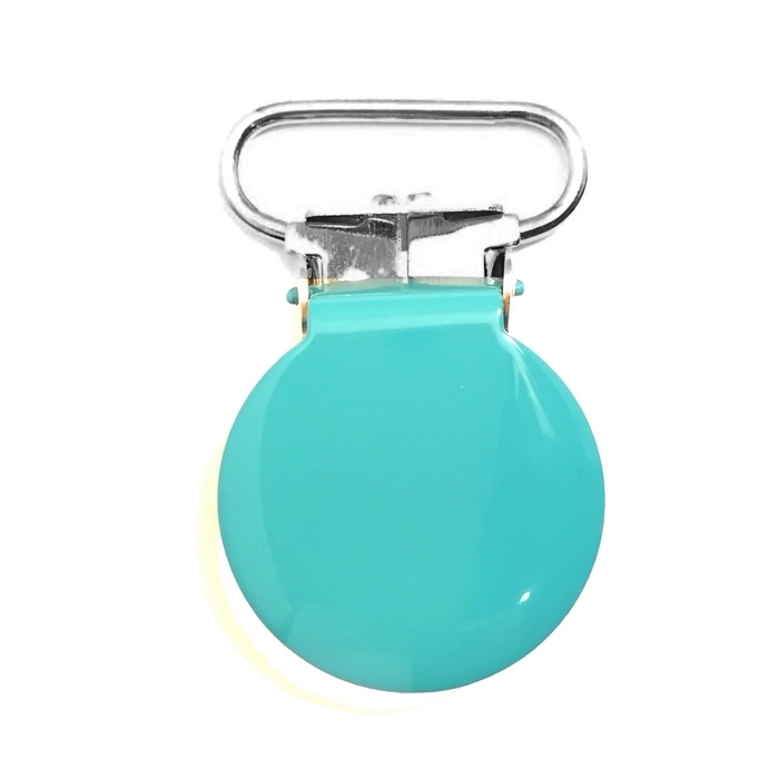 Seleclips til f. eks. suttekęder, selebukser eller barnevognskęder. Den runde seleclips er i farven turkis.