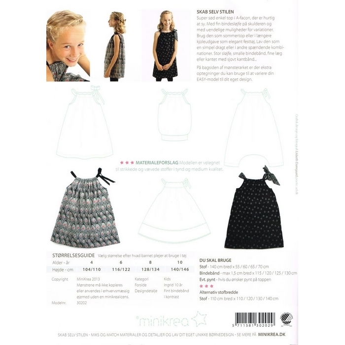 Snitmønster fra Minikrea. Som sædvanligt et skønt symønster til de halv- og helt store piger i alderen 4 til 10 år. Denne gang en klassisk A-top, der også kan laves til kjole i flere variationer.