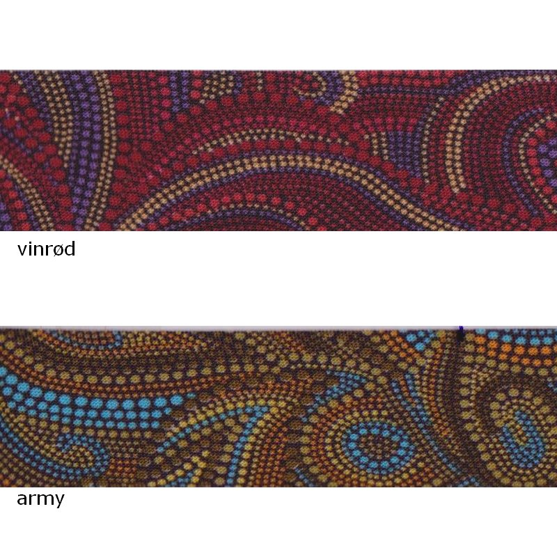 Skråbånd med et mønster sammensat af små prikker. Kantebåndet fås i to farvestillinger vinrød og army.