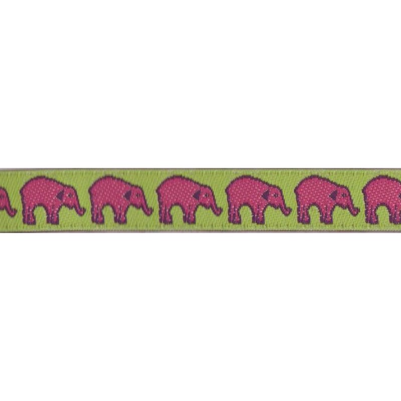 Pyntebånd til beklædning og accessories. Båndet har lyserøde (pink) elefanter marcherende langs det limegrønne bånd.